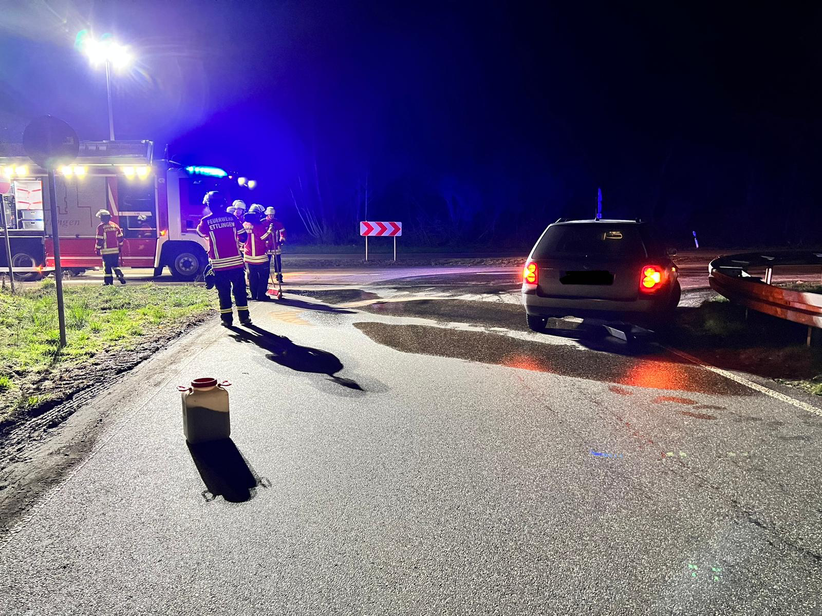 Ein PKW hatte sich bei einem alleinbeteiligten Unfall im Bereich B3 den Tank aufgerissen. Durch die Feuerwehr wurde der Kraftstoffaustritt mittels Schuttmulde und Bindemittel-Damm gestoppt sowie die B3 von Trümmern gereinigt. Die Nassreinigung der Fahrbahn erfolgt im Auftrag der Polizei durch eine Fachfirma.