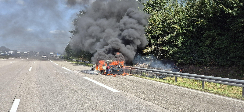 Ein PKW stand auf der Autobahn kurz vor der Anschlussstelle Karlsruhe-Süd in Vollbrand, wodurch ein Bankettbrand verursacht wurde.