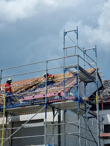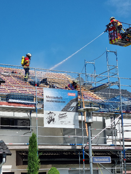 Der Löschzug der Abteilung Ettlingen-Stadt wurde mit dem Löschzug Tal und dem ELW 2 der Feuerwehr Malsch zu einem Dachstuhlbrand in Oberweier alarmiert. Beim Eintreffen der Feuerwehr war eine Rauchentwicklung im Bereich des Daches eines Reihenmittelhauses sichtbar. Wegen Baumaßnahmen war das Dach nicht gedeckt und das Gebäude eingerüstet. So konnten die Trupps unter Atemschutz über das Gerüst vorgehen und das brennende Dämmmaterial ablöschen, wozu auch die Drehleiter zum Einsatz kam. Da sich bei dieser Art von Dämmplatten im Inneren Glutnester bilden können, die von Außen nicht erkennbar sind, wurde das Material großflächig entfernt.