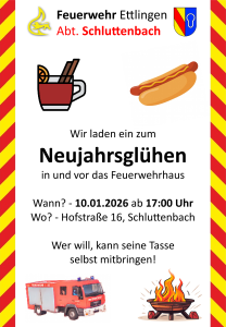 Ab 17 Uhr veranstaltet die Abteilung Schluttenbach ein Neujahrsglühen am Feuerwehrhaus Schluttenbach: