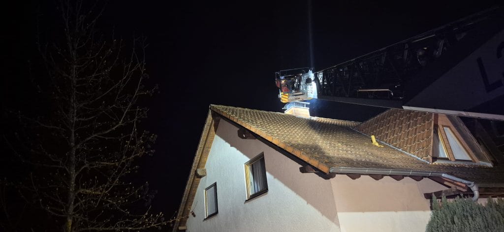 Durch den verständigten Schornsteinfeger wurde über die Drehleiter der Kamin ausgekehrt, die Feuerwehr kontrollierte den Kamin sowie die umliegenden Wände und Bebauungen.