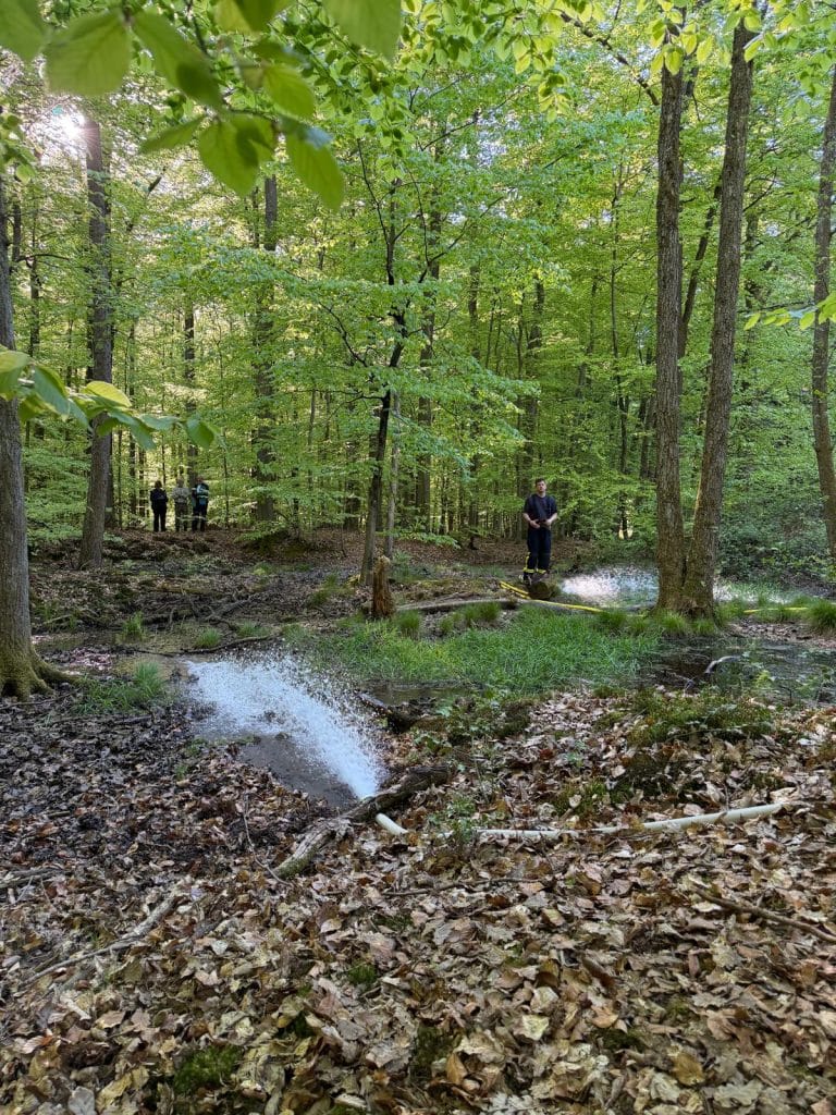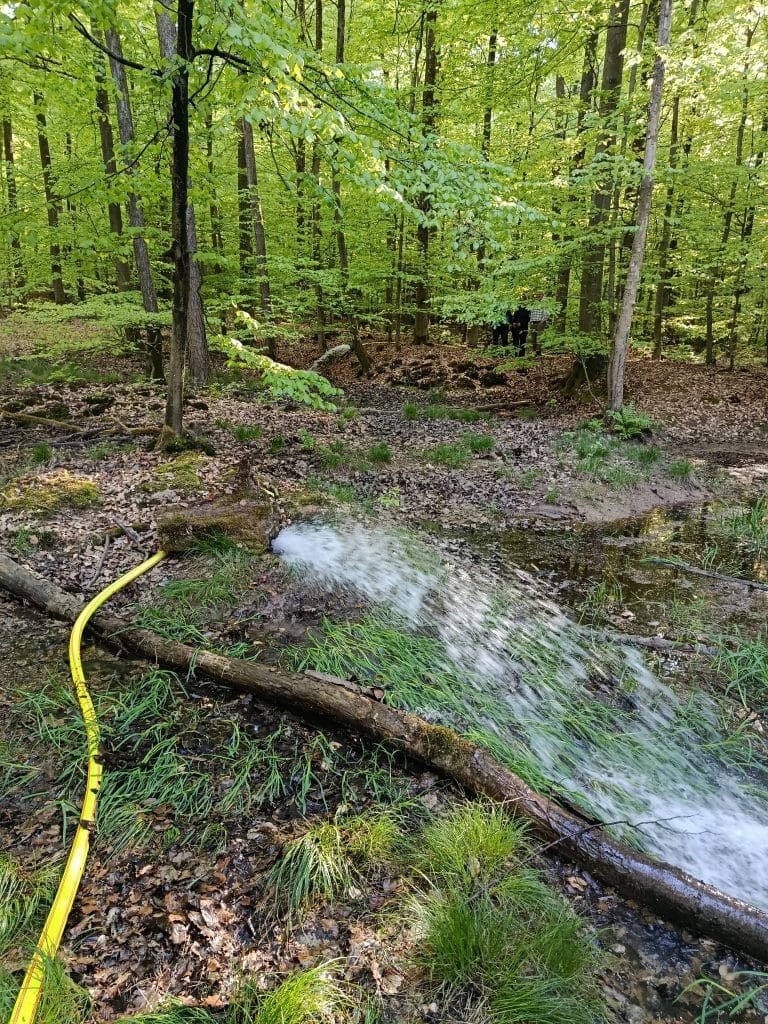 In das Feuchtbiotop, in dem aktuell unter anderem Feuersalamander, Frösche und Kröten laichen, füllte die Feuerwehr Ettlingen mehrere tausend Liter Wasser.