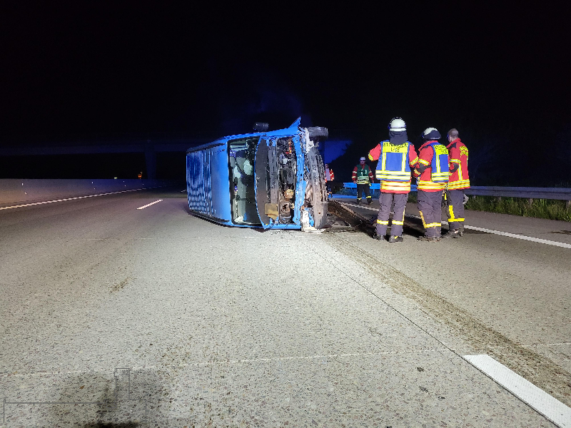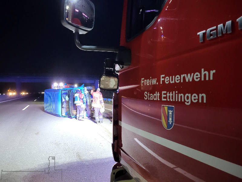 Die Abteilung Ettlingen wurde zu einem PKW-Brand auf der A5 in Richtung Süden alarmiert. Nach einem Verkehrsunfall war ein Kleinbus auf die Seite gekippt und es war im Bereich des Motorraumes zu einer Rauchentwicklung gekommen. Von der Feuerwehr wurde das Fahrzeug mit der Wärmebildkamera kontrolliert. Die Einsatzstelle wurde für die Polizei ausgeleuchtet und bis zum Eintreffen der Autobahnmeisterei abgesichert.