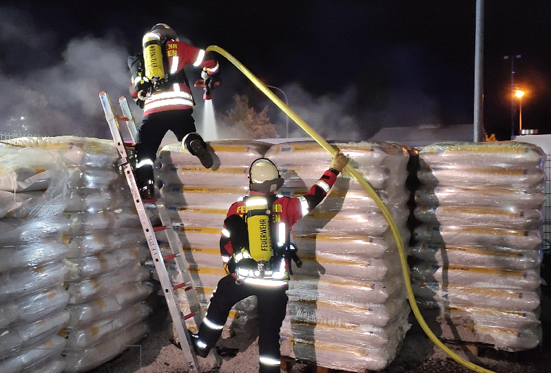 An mehreren Paletten Schuttdemmung aus Vulkangestein kam es zu einem Brandereignis, mit einem Gabelstapler wurden die Paletten zunächst auseinandergezogen. Im Anschluss wurde der Brand mit mehreren C-Rohren unter Atemschutz abgelöscht.