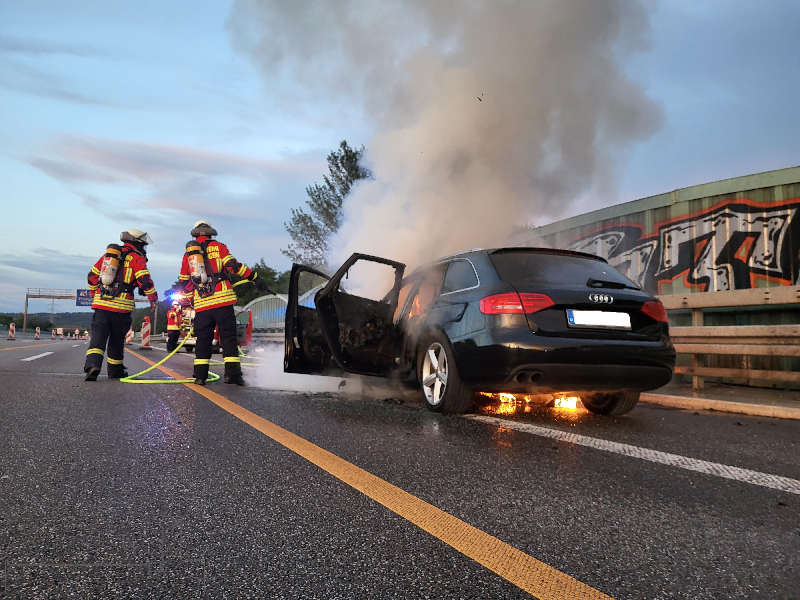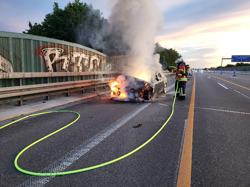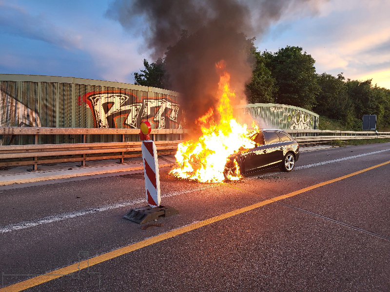 Nach einem Auffahrunfall im Baustellenbereich zwischen einem PKW und einem Sattelzug kam es zu einem Brand an einem PKW. Der Brand wurde durch die ersteintreffenden Feuerwehr Ettlingen mit zwei Trupps unter Atemschutz abgelöscht. Eine Tätigkeit der Kräfte der Feuerwehr Karlsruhe war nicht mehr erforderlich.