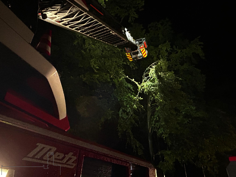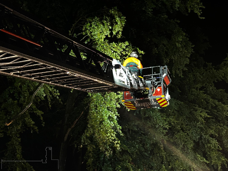 Ein teilweise abgebrochener Ast, welcher sich auf 13 Meter höhe befand, wurde über die Drehleiter vollständig abgesägt. Anschließend wurde dieser durch Abt. Waldprechtsweier von der Straße entfernt.