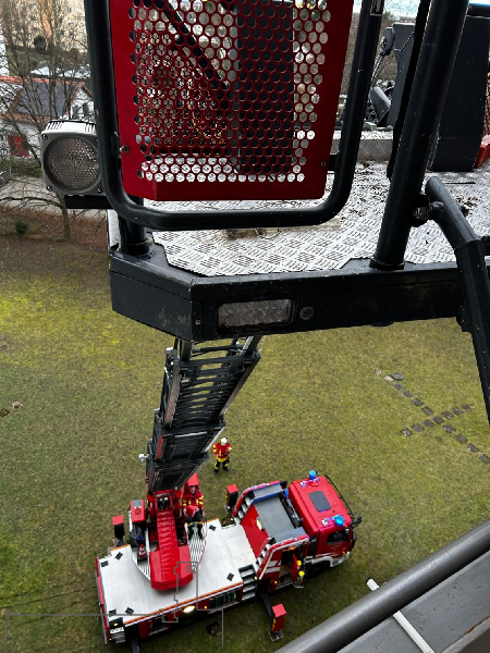 In einem Wohnkomplex in der Schuhmacherstraße kam es zu einer medizinischen Notlage. Da mit dem Originalschlüssel die Wohnungstür nicht zu öffnen war, wurde von der Feuerwehr die Tür mithilfe von Spezialwerkzeug geöffnet. Gleichzeitig wurde versucht, über die Drehleiter einen Zugang zur betroffenen Wohnung herzustellen.