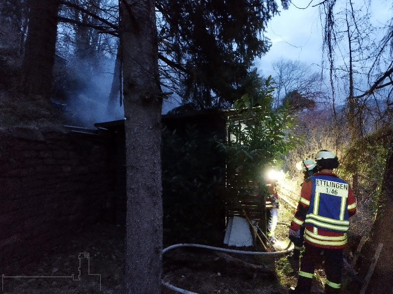 Der Löschzug der Abteilung Ettlingen-Stadt wurde zusammen mit der Feuerwehr Waldbronn zu einem Gartenhüttenbrand in die Pforzheimer Straße gerufen. Ein Mitarbeiter eines Industriebetrieb vernahm mehrere laute Explosionen mit anschließender Rauchentwicklung aus einer Kleingartenanlage am Robberg.