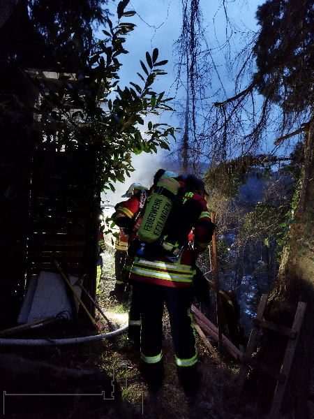 In einem unwegsamen Gelände kam es in einem Steilstück zu einem Brand einer Gartenhütte, welcher durch die Feuerwehr mit einem C-Rohr und mehreren Trupps unter Atemschutz abgelöscht werden konnte. Während der Löscharbeiten konnte ein Hund aufgefunden werden, für welchen jede Hilfe zu spät kam.