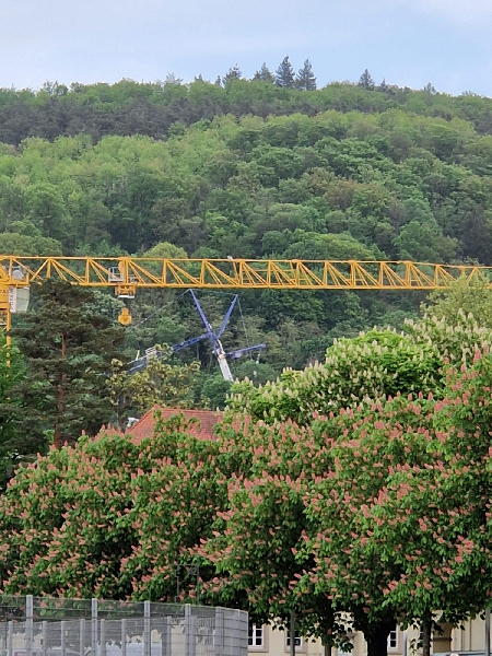 Es handelte sich um einen Mobilkran, dessen Ausleger am Boden schräg abgelegt war, was jedoch aus der Entfernung aufgrund der Bäume nicht erkennbar war.