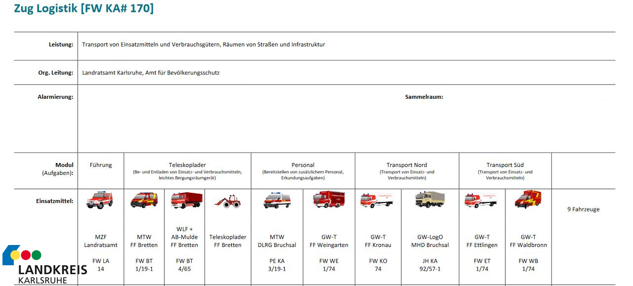 Zu den verladenen Komponenten gehören unter anderem Zelte, Notstromgeneratoren, Sitzgelegenheiten sowie Materialien für die Trinkwasserversorgung (Duschmöglichkeiten), die Brauch- und Abwasserversorgung (Toiletten) und die Verpflegung von etwa 30 Einsatzkräften, welche bei Bedarf auf bis zu 100 Einsatzkräfte erweitert werden kann.